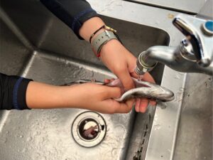 子どもたちが生きているニジマスをつかんで、内臓を取り出します。