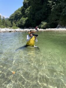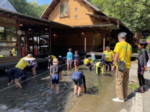 気温35℃で暑い暑いと言っていた子どもたちは冷たい川でおおはしゃぎです。