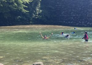 川へ思いっきり飛び込んだり、リーダーと水をかけ合ったり、太陽の光を浴びて温まったりとそれぞれの楽しみ方で川遊びを満喫していました。