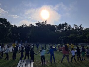 キャンプは2日目になりました。子どもたちは元気にバンガローから起きて出てきました。