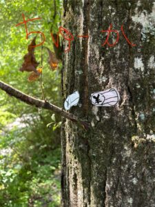 画用紙に目玉を描いて切り抜き、キャンプ場内の木々や人工物に貼り付けて写真を撮る作品づくりをしました。