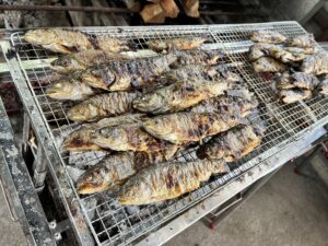 川遊びから帰ってきた子どもたちはおにぎりとニジマスを食べています。
