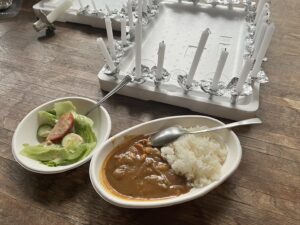 倉庫で夜のアクティビティの準備をしていると、やむちゃん班の男の子2人がカレーライスを届けてくれました。