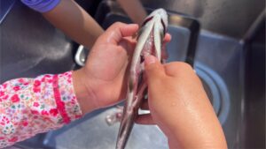 内臓を取り出すことに抵抗感を抱く子もいますが、一生懸命内臓を取り出していました。