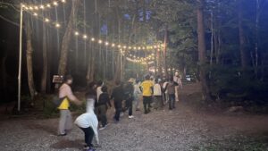 文字通り真っ暗な森の中を懐中電灯を使わずに歩いて行きます。