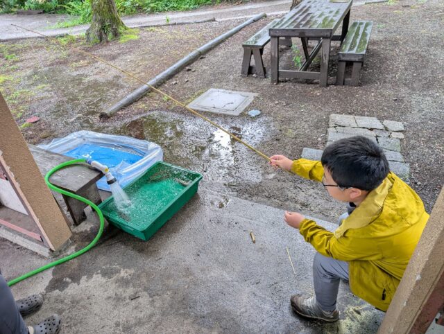 朝一の活動は、つりをしたい!という子の発案で、釣り具を手作りして、生け捕りにしたニジマスを釣り上げる作戦を決行。