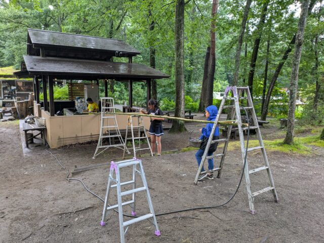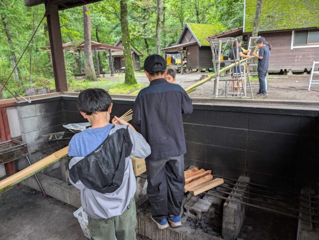 お昼の「流しそうめん」のために、ニジマスつかみに行かない子たちと、竹を割り、節を抜き、土台作り。