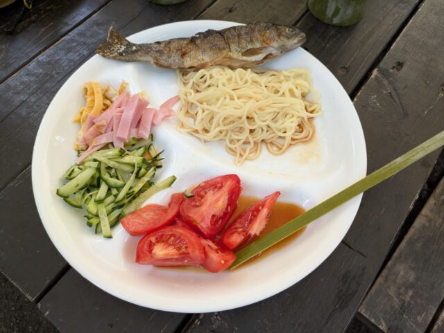 お昼ごはんは流しそうめんと冷やし中華。とニジマス。