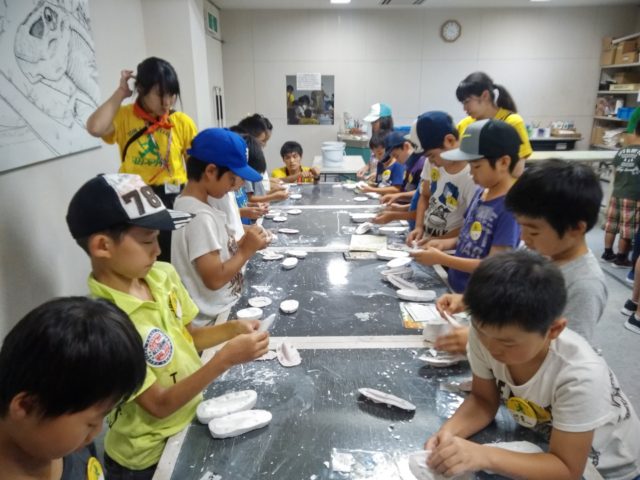 15時からは「化石レプリカ作り(写真)」。アンモナイトやティラノザウルス歯の化石など、それぞれ好みの化石を選んで石膏でレプリカつくりを行いました。