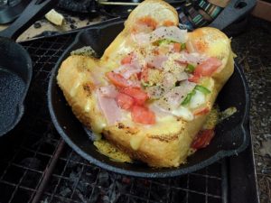 08:00 24℃晴れ。朝の散歩を終えて、朝ごはん中。ピザトーストをスキレットで作りました。