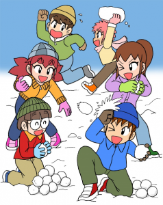 一人で黙々と雪を積み上げる子。その周りで雪の投げ合いに興じる子。積み上げていた子も巻き込まれて雪合戦、そのうち飽きて、みんなで雪を積み始める。雪玉が大きくなり過ぎで一人で抱えられなくなって、みんなで立ち上げたら、身長を越える雪だるまができて歓声があがる。数時間前に初めて顔を合わせたのに、ずっとまえから知っているかのように遊んでいます。