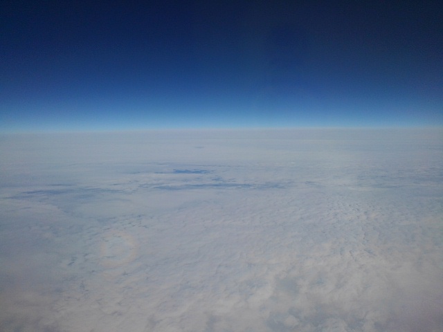 飛行機を降りて調べてみたら、飛行機の影と雲に当たる太陽光によって現れるブロッケン現象と呼ばれるものと判明。何度も飛行機乗っていますが、なんとなく見過ごしている中に、いろんな発見があるものだ。