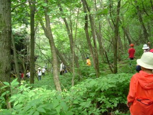 途中、元気なアオダイショウにも遭遇!「ヘビに触れたことが無い」という学生らの声に、アオダイショウにはしばらく教材になってもらって皆で「ヘビにさわる」体験も実施。梅雨の晴れ間の楽しい散策となった。Tomくま