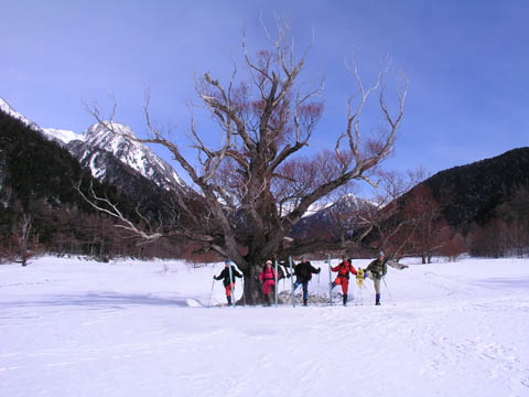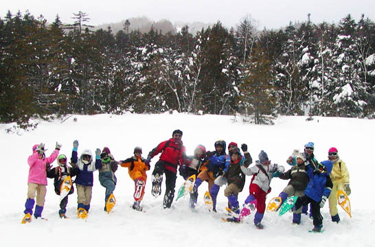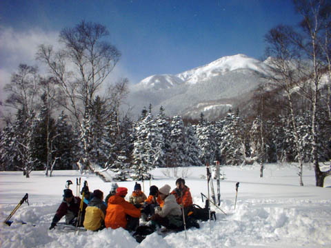 乗鞍雪遊学校の活動を紹介する写真です。今シーズンは、名古屋駅集合/出発、松本駅集合/出発、新宿駅集合/出発、3つの集合場所を用意しました。このコースでは、スキー場を飛び出して、真っ白な雪におおわれた高原にスノーシューやネイチャースキーをはいて出かけていきます。ワイルド志向のあなたにおすすめのコースです。
