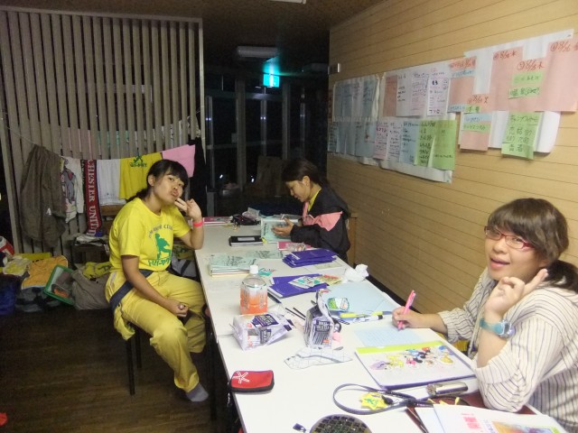 きょうはサマーキャンプにて、参加者のみんなが眠ったあとのリーダー写真を紹介。ガイドブック絵日記のページの返事書きをしたり、翌日の活動の準備をしたり、リーダー同士で議論していると、あっという間に深夜に・・・・・