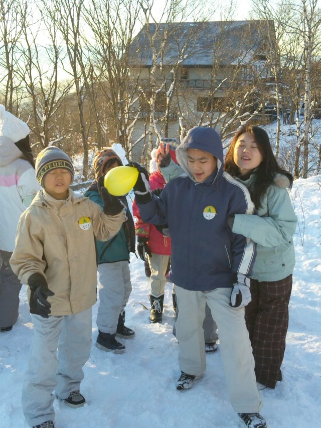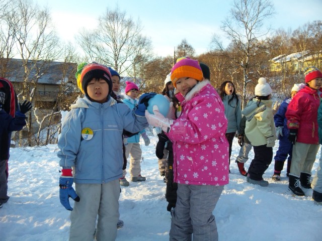 朝は寝ぼけた身体と心を目覚めさせる活動をします。日の出をみんなで眺めた後は、フウセンを使った遊びを二つ。フウセンを後ろに手渡す風船送り。写真のフウセンリレー。二人組で風船を支えて運びます。息を合わせるのがポイントです。以上、ひっしーより。