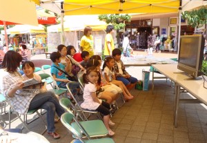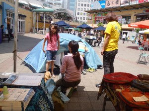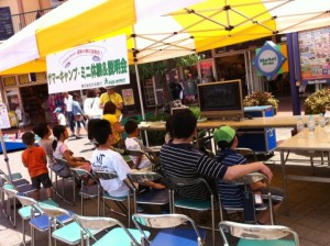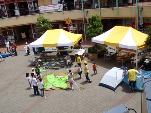 5月21-22日の週末の2日間、東京都江東区亀戸にあるショッピングモール「サンストリート亀戸」にて説明会&キャンプ・ミニ体験のイベントを実施しました。サンストリート亀戸には、2階に日本旅行の店舗があるため、ここを通じて今回の説明会&キャンプ・ミニ体験の実現にいたりました。日曜日こそ、終了間際に雲行きが怪しくなり、冷たい風が吹き、雨ふりとなりましたが、この時間帯以外は好天に恵まれ100人近い方々に、親子でサンストリート探検&イマドキのテント立て体験を楽しんでいただくことができました。