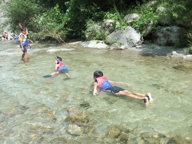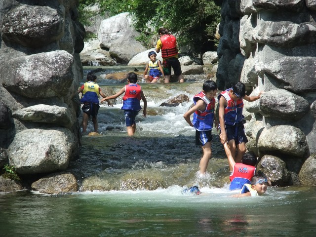 白州では、数年前にライフベストを購入して以来、堰堤下のプール状の場所で泳いだり飛び込みをしたりする川遊びが恒例となっている。実は、この堰堤から上流の数百メートルは、一昨年以降どんな様子に変化しているか確認していない未知の流域だった。今年は「ねぇ、この先はどうなっているのか”たんけん”してみたい」という参加者の言葉に促され、参加者&リーダーのみんなで川をさかのぼる探検にでかけた。