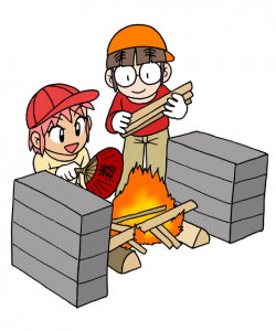 「そんなの知っているよ!」という声が聞こえてきそうですが、実際に薪に火をつけようと挑戦してみると、はじめはみんな、なかなかうまくいきません。薪を割ったり、新聞紙の丸め方、薪の組み方、マッチの擦り方、ひとつずつにコツがあり、奥が深いんです。実は、苦手意識のあるリーダーも多いとか。「知っている」と「できる」の間には、高~い カベ があるんですね~。キャンプの火おこしでたくさん失敗して、どうやったらうまくいくかを考え、何度も練習して「できる」側の人を目指しましょう!マッチが擦れるだけでちょっとした自信がつきますよ!