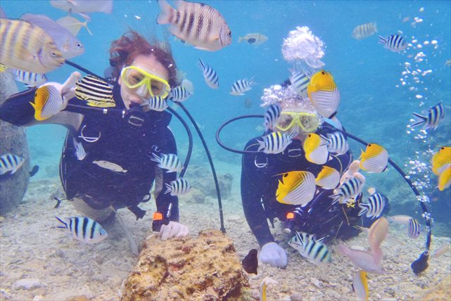 北谷で体験ダイビングをエンジョイ!ライセンスが無くても、スタッフのエスコートで海中散歩を楽しめます。当店ではお客様が笑顔になれる体験をご提供しています。流れ作業のようなダイビングとは無縁、目配りと気配りが行き届いたサポートがモットーです。少人数で貸切りのプランだから、初めてでもリラックスできますよ。