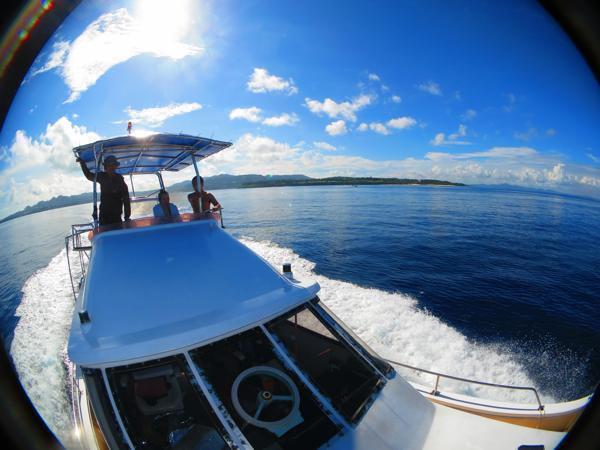カタマランの大きな船で出港!揺れにくい大型船です。