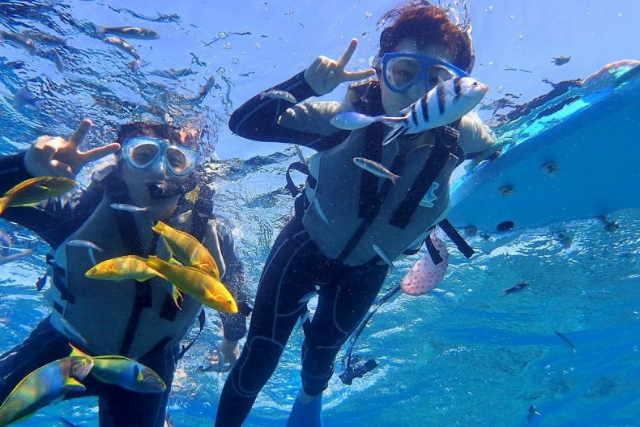手軽に遊べるシュノーケルと海を深く楽しめるダイビングを、どちらも満喫できるよくばりなプランです!しかも、ビーチから入るスタイルと違って、ボートでポイントまで行く本格的なスタイル。ダイビングが初めての方も