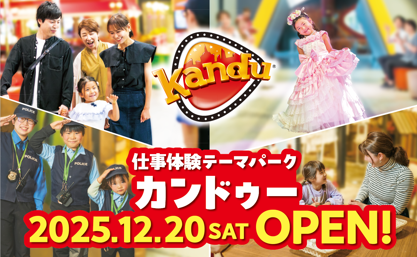 屋内型仕事体験テーマパーク「カンドゥー大日」が、西日本エリア初としてオープン!,親子3世代でお楽しみいただけるテーマパーク「カンドゥー」。 子どもたちがさまざまな仕事にチャレンジしながら、楽しみ・学び・成長できる体験型テーマパークです。仕事をするとカンドゥー内で使用できる疑似通貨「カッチン」がもらえるなど、社会のしくみをリアルに感じられるのも魅力です。体験を通じて、責任感・自立心・協調性・自信など .....もっと見る