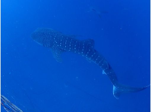海中イケスの中にいるジンベエザメをスノーケルでは約2mの距離で観察することができます!