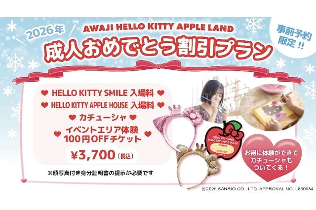 新成人限定のお得なプランがスタート!,「AWAJI HELLO KITTY APPLE LAND」で、2026年に成人を迎える方限定の特別プランが登場! HELLO KITTY SMILE と HELLO KITTY APPLE HOUSE の 2施設の入場料がセットになり、さらに カチューシャも付いてくるお得な内容です。 イベントエリア体験に使える 100円OFFチケットもセットなので、ワーク .....もっと見る