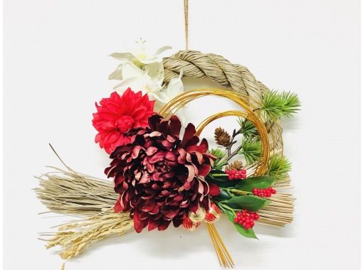 天然藁のしめ縄にアートフラワーやオーナメント、水引などを選んで作ります。