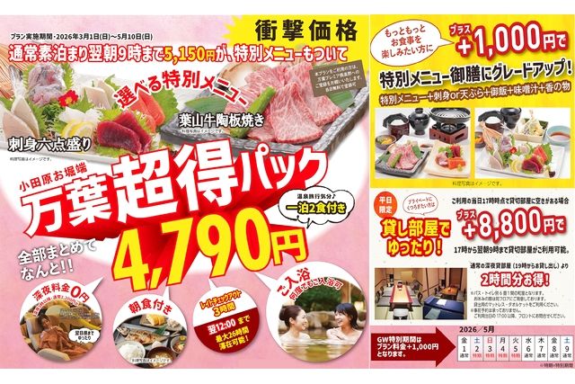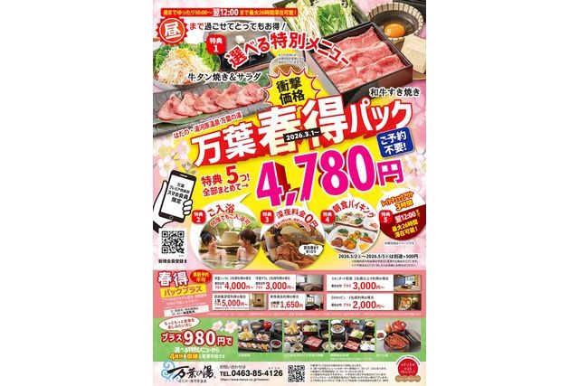 4,790円でお泊り温泉旅行気分♪万葉超得パック 翌日12:00まで最大26時間滞在可能!2食付き,入館料+肉か魚か!選べる特別メニュー+深夜料金+翌朝延長滞在3時間分+ご朝食がセットの大変お得なプランです。 朝10時から翌12時まで!昼までのんびり、最大26時間滞在可能! <選べる特別メニュー> ①刺身六点盛り ②葉山牛陶板焼き ※選べる特別メニューのオーダー時間は11:30~21:30の間にご注文下さいませ。 ※仕入れ状況により料理内容が変更になる場合がございます ※5/2(土)~5/5(火)は特別期間のためプラン料金+1,000円となります。,,