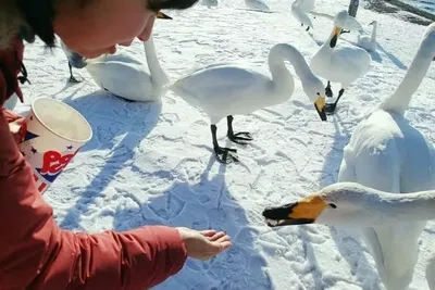 ・遠いシベリアからやってくるオオハクチョウやカモとスキンシップを取った後、ゆっくり湖畔を歩いて行きます。