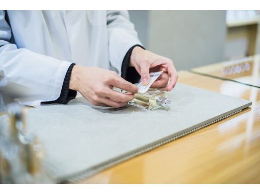 お客さまがつけた名前のラベルを貼りつけます。世界に一つの香りの完成です。
