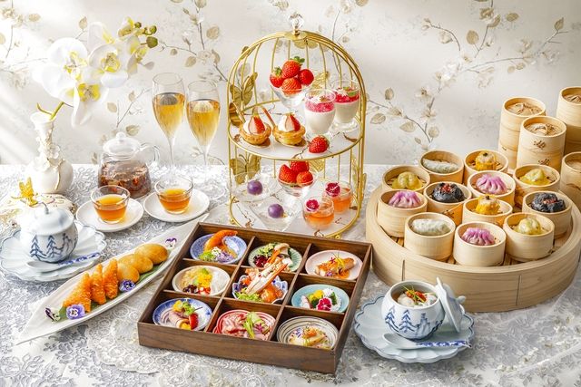 点心食べ放題!食後には鳥籠風アフタヌーンティースタンドでスイーツがお楽しみいただけるプレミアムランチ,優雅なアフタヌーンティースタンドを用いた4種類のスイーツとフレッシュ苺をお楽しみいただけるチャイニーズアフタヌーンティー。 さらに、ひと皿ずつ丁寧に仕上げたお食事全9品や極上コラーゲンスープを含むシェフズスペシャルと、お代わり自由の点心7種もセットになった贅沢な内容となっています。 ウェルカムドリ .....もっと見る