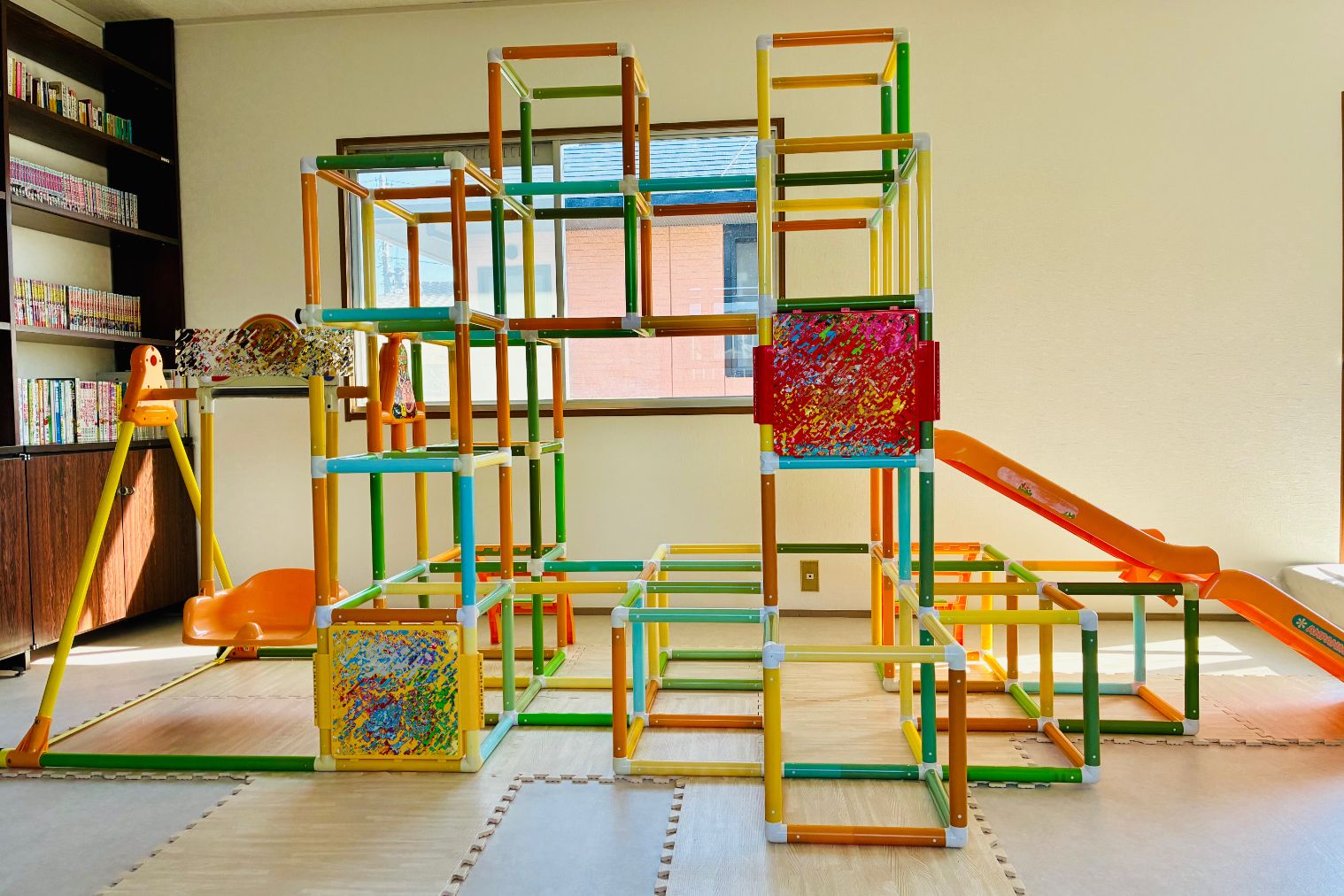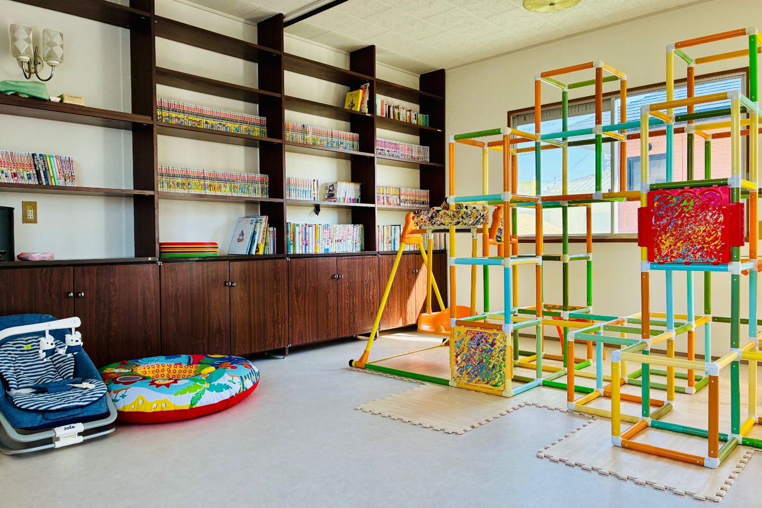 室内アスレチック×知育レゴで遊べるキッズスペース,自宅2階をリフォームしてキッズスペースをオープンしました。16.5畳のお部屋には巨大ジャングルジム、鉄棒、トランポリンを設置。雨の日でも思いっきり体を動かして遊べます。また、壁一面の本棚にはたくさんの絵本や漫画が!親御さんも飲み物を飲みながらゆっくりと子どもたちを見守れます。(入場料にワンドリンクが含まれますが、飲食物の持ち込みもOKです)そして、8畳のお部屋には大量のレゴデュプロが!大きくて扱いやすいので、小さいお子さまも安心。誤飲の心配もありません。ご家庭にはない量と色々な種類のレゴデュプロブロックで、自由な発想で遊べます。デュプロトレインのほか、レゴスクールで使われるレゴエデュケーション教材も導入。遊びながら学べる知育キッズスペースです。,赤ちゃん連れでも安心のベビーフレンドリー設計,小さいお子さまも安心して遊べるように、誤飲の恐れのある小さいおもちゃは置いておりません。赤ちゃん向けのバンボやバウンサー、お昼寝コットもご用意しております。フロアにはキッチンがあるので、離乳食の温めやミルクの調乳も行えます。授乳の際は別室をご案内するのでお声がけください。トイレにはベビーキープがあり、お子さまとご一緒にご利用いただけます。オムツゴミ箱もありますので、安心してお立ち寄りください。