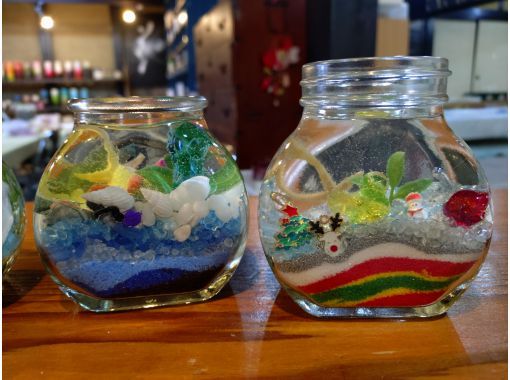 差材を選んだらカラーサンドやサンゴで文字を描き、あとは貝殻やなどで自由に飾りつけをすれば完成です。 .....もっと見る
