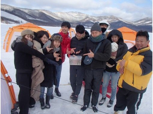 全面凍結した湖上でワカサギ釣り専用テントで、楽しいひと時を過ごしてみませんか?