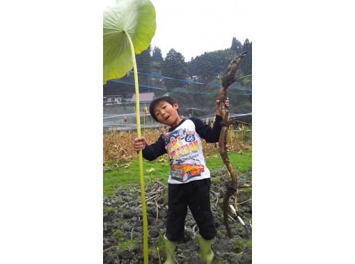 まるで遺跡発掘か、宝探しか!!どこに埋まっているかわからないレンコンを、クワで1本1本丁寧に慎重に堀上げます。土から取り上げる時の喜びを味わってください。