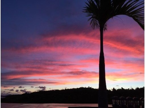 小浜島の西側にある西表島に太陽が沈む為、一般的に水平線や地平線に沈む夕焼けとは焼け方が異なり、真っ赤なオレンジと言うよりもピンクや紫色に染まる事が多く、とても幻想的で非日常的な空間に包まれます。
