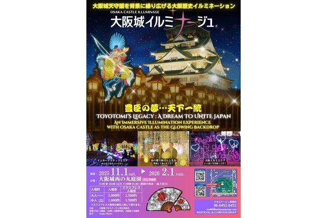 大阪城天守閣を背景に繰り広げる壮大な大阪歴史イルミネーション,2025年11月1日(土)から2026年2月1日(日)の期間中、大阪城 西の丸庭園にてイルミネーションイベント「大阪城イルミナージュ」が開催されます。 今年のテーマは「豊臣の夢... 天下一統」。 豊臣が描いた理想と、徳川が実現した未来を、光と音で幻想的に描き出します。 当ページからのお申し込みで、開催期間中にいつでも購入・利用できる入場券をご購入いただけます。,戦国の世に想いを馳せる、没入型のナイトエンターテインメント,大阪の象徴「大阪城」を背景に、戦国時代の志と野望が光と音の演出によって鮮やかに蘇ります。 今年は、全身の侍武者を中心とした立体展示を大幅に拡充し、幻想と歴史が融合する世界を創出。 さらに、無数の灯籠が立ち並ぶ荘厳な光の道「灯籠回廊」や、 通天閣・道頓堀など大阪を象徴するスポットを再現した人気の「大阪イルミ観光地シリーズ」も展開され、 フォトジェニックな体験をお楽しみいただけます。 .....もっと見る.....閉じる