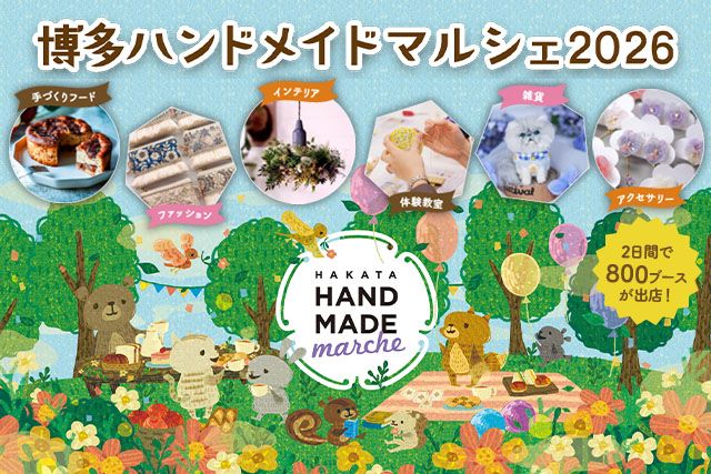 800ブースの手づくり作家による九州最大級のハンドメイドの祭典,博多ハンドメイドマルシェは、福岡国際センターを会場として、全国から集まったハンドメイド作家による15,000点以上のオリジナルの手づくり作品や手づくりフードが自由に展示・販売される九州最大級のハンドメイドイベントです。 また、当日はハンドメイド未経験の方でも老若男女を問わずに世界にひとつだけのハンドメイド作品づくりが体験できる「マルシェのがっこう」も開催します。 実に様々な分野から集まったハンドメイド作家が一同に会する2日限りの”ものづくり”の祭典。 ここでしか出会うことができない皆さんのお気に入りの1点を探しに、博多ハンドメイドマルシェに是非ご来場ください。,, .....もっと見る.....閉じる