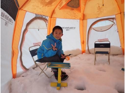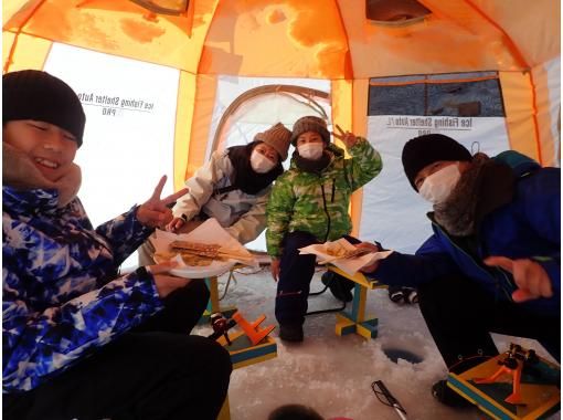 凍った湖の上でのわかさぎ釣りです。釣れたわかさぎは、てんぷらなどにしてお召し上がりいただきます。