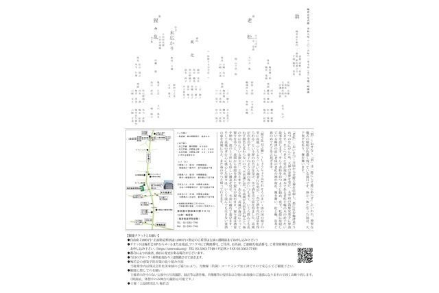 能 翁・能 老松,『翁』~おきな~「翁」は「能にして能にあらず」といわれ、神聖な儀式の様相が色濃く残っている演目です。神と一体となった翁は、天下泰平を祈り、舞を舞います。 『老松』~おいまつ~日頃から北野天神を信仰し、都に住む梅津某(うめづのなにがし)は、天神の霊夢を受け、太宰府の筑紫安楽寺に参詣します。そこへ老人と男が現れ、神木である老松と梅の木のめでたい故事を話します。そして奇特を待つように勧め、夜半、松蔭に旅寝している梅津の前に老体の老松の神が現れ、舞を舞い、松と梅、長寿と春のめでたさを言祝ぎます。,能 猩々乱 双之舞,『猩々乱 双之舞』~しょうじょうみだれ そうのまい~唐の国の揚子の里に高風(こうふう)という親孝行な男が、「市で酒を売れば富を得られる」という夢のお告げを受け、市で酒を売り富を得ました。高風が店を出すと、童子のような顔の客がいつも来て、いくら飲んでも乱れず顔色も変わらないので、不思議に思った高風が名前を訪ねると「海の中に住んでいる猩々だ」と答えます。ある夜、高風が海辺に立って猩々を待つと、波間から仲間を連れた猩々が現れます。猩々達は酒宴を始め、波の上で世にも珍しい舞姿を見せ、水面に戯れて遊びます。そして高風の孝行心に感心した猩々は、いくら汲んでも尽きない霊酒の壷を高風に与え、また海の中へと帰って行きます。
