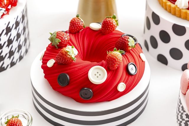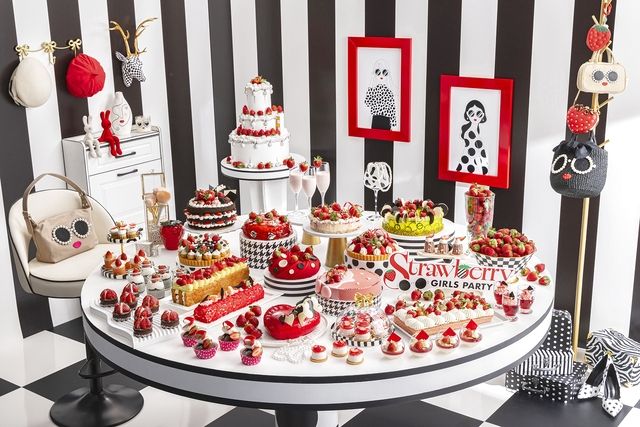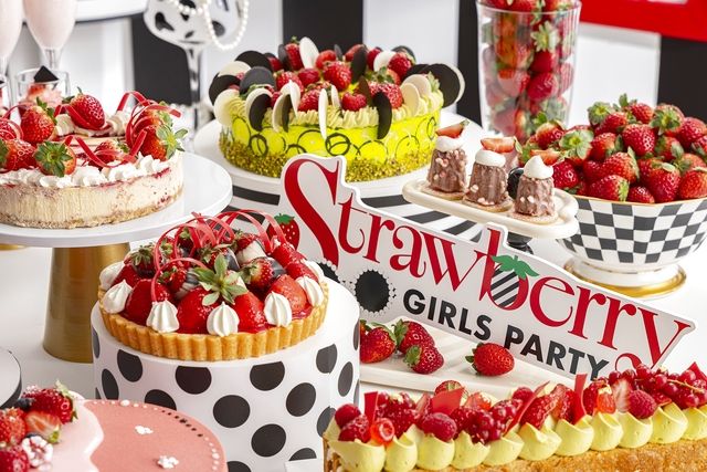 スイーツビュッフェ,ヒルトン東京では毎年恒例のいちご尽くしのスイーツビュッフェを開催します。今年のテーマは「ストロベリーモノクロ・ガールズパーティー」白と黒を基調とした世界観で、ガールズパーティーの高揚感をお楽しみいただけます。また、大人可愛いテイストと、ユーモアあふれるファッショングッズを手がけるブランド「a-jolie」とのコラボレーションも実施。イラストレーターワタナベマリエがa-jolie描き下ろしたイラストも加わり”a-jolieらしい”キュートでポップなアクセントを添えます。20種類以上のスイーツは、タルトやパイなど苺の美味しさを多彩に味わえるスイーツが揃います。さらにフレッシュ苺もお好きなだけお楽しみいただけるなど、苺の祭典にふさわしい内容となっており、スイーツとともにお楽しみいただけるセイヴォリー全8種類も用意。スイーツの合間の箸休めとしてはもちろん、遅めのランチとしてもご満足いただけます。ドリンクはドイツの高級紅茶ブランド ロンネフェルト社の紅茶10種類を含む18種類よりスイーツやお食事に合わせてお好きな物をお楽しみいただけます。,メニュー例,【スイーツ】 「ストロベリータルト」 「ストロベリー・ブラックドレス」 「ベリーベリークラッチ」 「ストロベリーハニードレス」 「マーブルオートクチュール」 「サングラスちゃんへ捧げるタルト」 「アジョリーハート」 「ボタン・ミニョン」 「ブロッサムピンク」 「キャロットプチシャポー」 「ストロベリーペタル」 「モノクロバブルムース」 「トロピカルベリーガーデン」 「ストロベリーファッショニスタ」 「ベルガモット・ガールズロール」 「オランジェプティショコラ」 「ブラックベリーダイヤモンド」 「スパイスガールズ」 「パンナコッタ・ルージュ」 「ストロベリーシャンパン」 「チョコレートファウンテン」 「アイスクリームステーション」 「フレッシュ苺」 【セイボリー】 「チェリートマトとモッツァレラバルサミコジュレとストロベリーパール添え」 「ブロッコリーとポテトのフリッタータ クリームチーズとザクロモラセス」 「スイート&サワーミートボール 春野菜添え」 「白身魚のベイククラムチャウダーソース」 「筍ときのこの炊き込みご飯」 【飲み物】 「コーヒー」 「カプチーノ」 「カフェラテ」 「アイスコーヒー」 「アイスティー 」 「ドイツの紅茶ブランドロンネフェルト」
