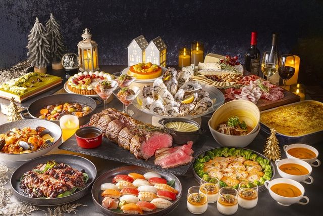 ディナービュッフェ,「マーブルラウンジ」では冬の味覚を心行くまでご堪能いただけるディナービュッフェを開催いたします。 「鴨胸肉の燻製 牛蒡のピュレとバルサミコジュレ」「帆立のエスカベッシュ」などの前菜に加え、バラエティに富んだ世界のチーズやシャルキュトリー、ホテルメイドブレッドも各種揃えております。 寿司コーナーでは、3種のネタをご用意しておりシェフが目の前で握ってご提供し、お1人様3個限定のオイスターは3種の楽しみ方にてお楽しみいただけます。 カービングコーナーにご用意する「ローストビーフサーロイン」は、ジュニパーベリ&ーポートワインで仕上げた特製ソースにてご賞味ください。 食後のデザートにはスイーツビュッフェより10種類の選りすぐりスイーツが登場するほか、チョコレートファウンテンやコールドアイスクリームもお好きなだけご賞味いただけます。 数々の料理や甘美なデザートが揃うディナービュッフェは友人との会食や女子会、クリスマスパーティーや新年会・忘年会など様々なシーンにおすすめでございます。,メニュー例,【注目料理】 <寿司ステーションより> 「握り寿司 3種」 「牡蠣」 ※牡蠣はお一人様につき3個のご提供となります。 <ライブステーションより> 「ローストビーフサーロイン」 【前菜・サラダ】 「シーザーサラダ」 「鴨胸肉の燻製」 「蕪のパンナコッタ」 「帆立とセロリ、蓮根、人参、長葱のエスカベッシュ」 「3種のチーズ」 「3種のシャルキュトリー」 【サラダバー】 【スープ】 「ローストトマトとバジルのブルーテ」 【パン】 「バゲット」 「ソフトロール」 「ドライフルーツのカンパーニュ」 「キャラメルリンゴとチョコチップパン」 「ほうれん草とベーコンのチャバタ」 【メインディッシュ】 「ベークドサーモン」 「鱈とスノーフィッシュのグラタンパイ 」 「牛肉の煮込み」 「ローストチキン」 「豚バラ肉のロースト」 「ムール貝とあさりのコンキリエ」 「味噌風味のローストダック」 「冬野菜のポトフ」 「バターチキンカレー」 【スイーツ】 「スイーツビュッフェより厳選10種のスイーツ」 「チョコレートファウンテン」 「アイスクリームステーション」 【コーヒー、紅茶各種】