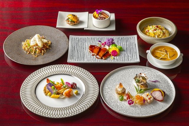 点心食べ放題!食後には3種類のデザートがお楽しみいただけるプレミアムランチ,美に対する強いこだわりを持ち、食や香りにも深い関心を寄せていたとされる楊貴妃の世界観を表現したランチプラン。全9品をひと皿ずつ丁寧に仕上げました。さらに、コラーゲンたっぷりの特製スープや3種類のデザートもセットになり、7種類の点心はお好きなだけお楽しみいただける贅沢な内容となっています。 お食事中は金木犀を思わせる花香とミルキー香が特徴のプレミアムティー「黄金桂」をご用意しております。,メニュー例,■お食事【王朝スペシャリテ&スープ】(1回限りのご提供) ・クラゲの冷菜 梅の香り甘酢ジュレ ・鮑の柔らか蒸し高菜入り葱生姜ソース ・ソフトシェルシュリンプの柿マヨネーズ和え ・炙りホタテのアボカドソース ・広東叉焼 ・棗バターナッツ添え ・手羽先の強火蒸し ライチ・ピーチ香るワインソース ・ズワイ蟹肉と銀杏の淡雪炒め ・春菊とピータンのサラダ スパイシー胡麻ソース ・松茸、クコの実入り鴨団子のスープ 菊の花飾り ■点心(お好きなだけお召し上がりいただけます) 蒸し点心 ・極上翡翠海老蒸し餃子 ・海老とニラ入り蒸し餃子 ・ホタテ貝入り蒸し餃子 ・豚肉、野菜入り桃色餃子 ・トリュフ香る海老、ホタテ入りポーク焼売 揚げ点心 ・海老と野菜のライスペーパー春巻 ・海老入り焼き餃子 ■デザート ・プーアールミルクティープリン ・キウイ、白キクラゲ入りライチゼリー ・エッグタルト、菊の花入りマーマレード添え ■ウェルカムドリンク ・アイスライチジャスミンティー ■スペシャル中国茶 ・黄金桂