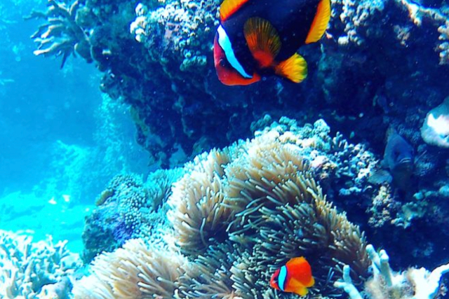 その日次第でサンゴの壁を泳ぐドロップオフシュノーケリングや、辺り一面サンゴ礁の場所へご案内することも!