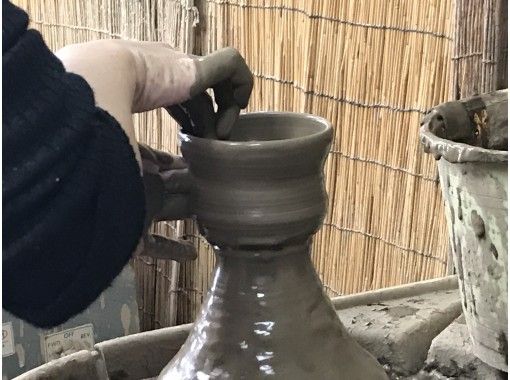 電動ろくろを使って、ミニ焼酎サーバー(3合入)・台座・カップ2個をお作りいただけます。後日、絵付けもしていただけます。