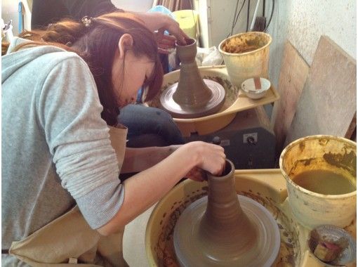 手ろくろの上でじっくり成形する手法です。料金には粘土代や焼成費も含まれています。持ち物はエプロンとタオルだけ。どなたでも気軽に陶芸を体験できますよ。