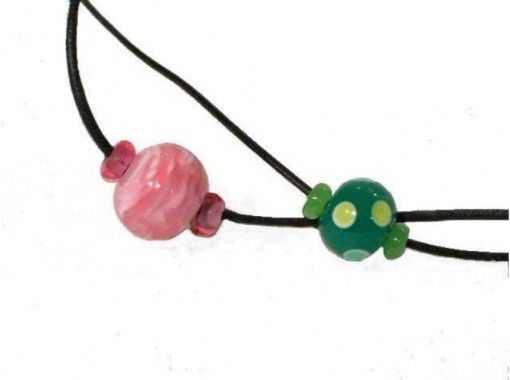 熱したガラス棒からとんぼ玉を作り、小玉と一緒にひもに通し、ペンダントやストラップに加工します。